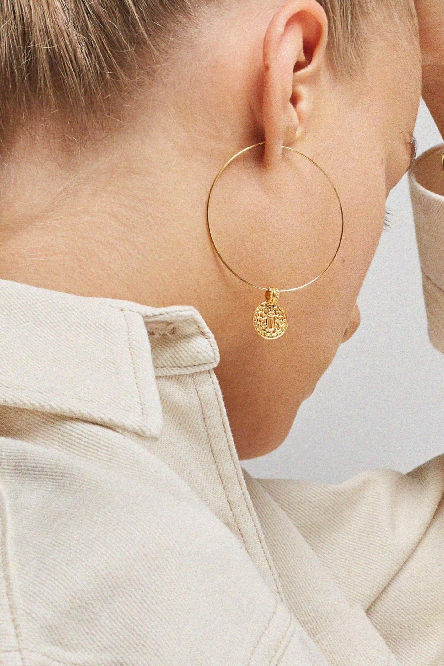 DOMITILLE1 is a round pendant made of vermeil and decorated with a beetle. The motifs inside the medal are engraved by hammering.