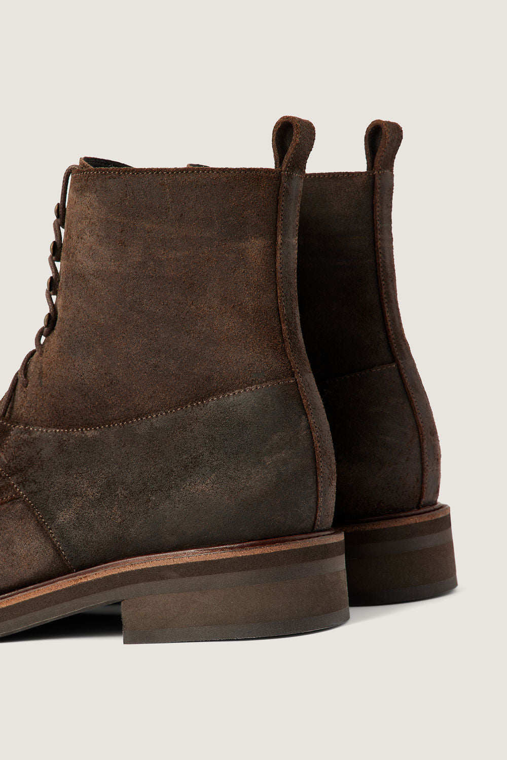 Charcoal oiled leather ankle boots - Lace-up high ankle boots- Natural oiled texture- Topstitch and cutout details- Metal hooks- Upper length: 14 cm- Heel height: 3 cm- LWG leather