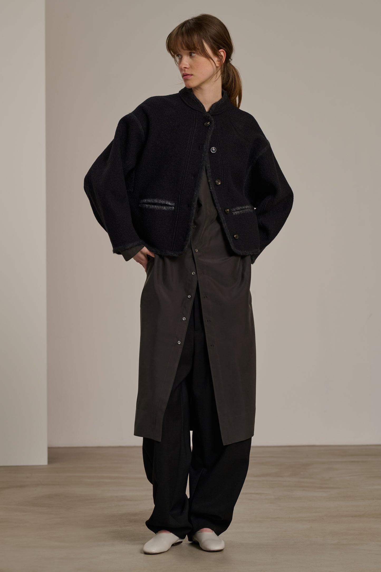 OLYMPE is a thick wool jacket with a short, beautifully suspended silhouette above the waist. It pairs just as well with tailored trousers as it does with relaxed jeans, offering versatility that will enhance all your outfits.